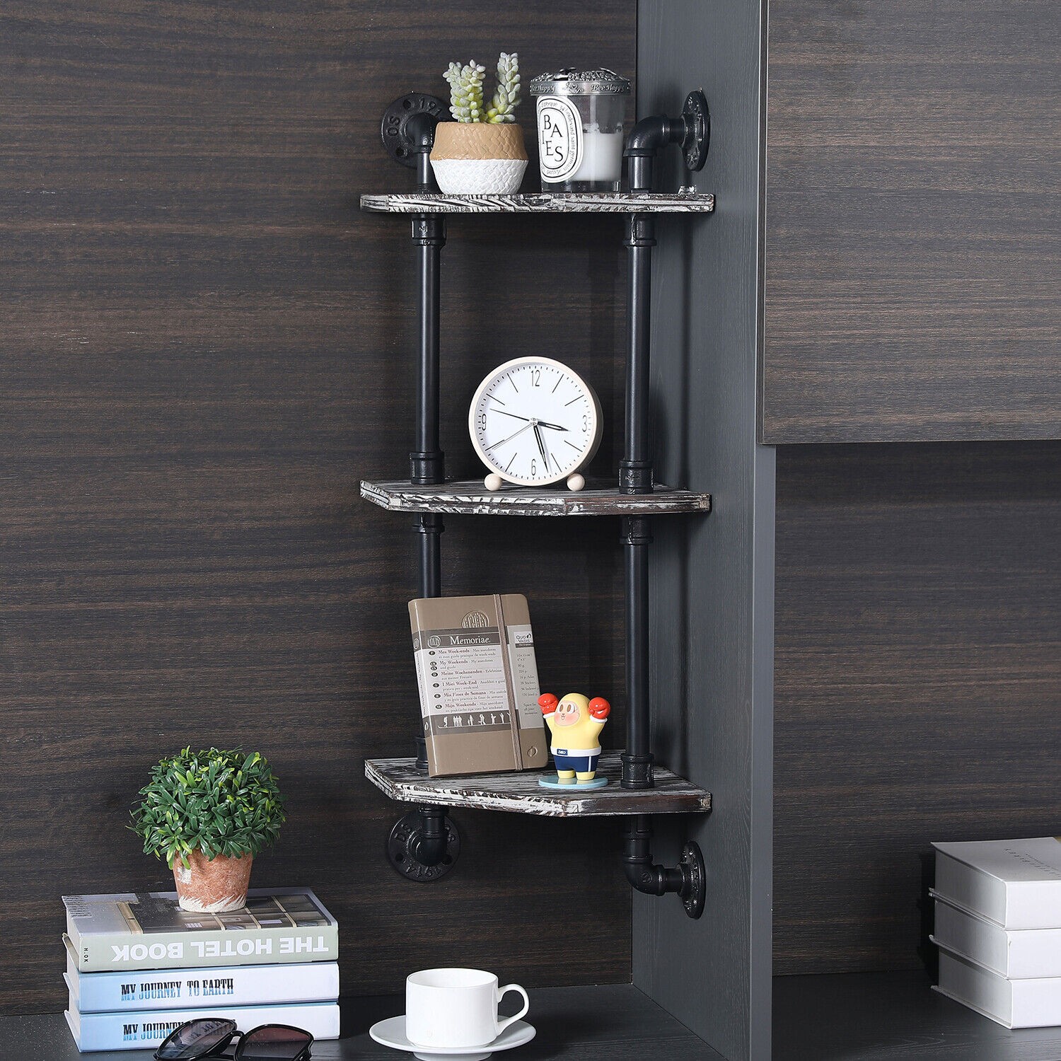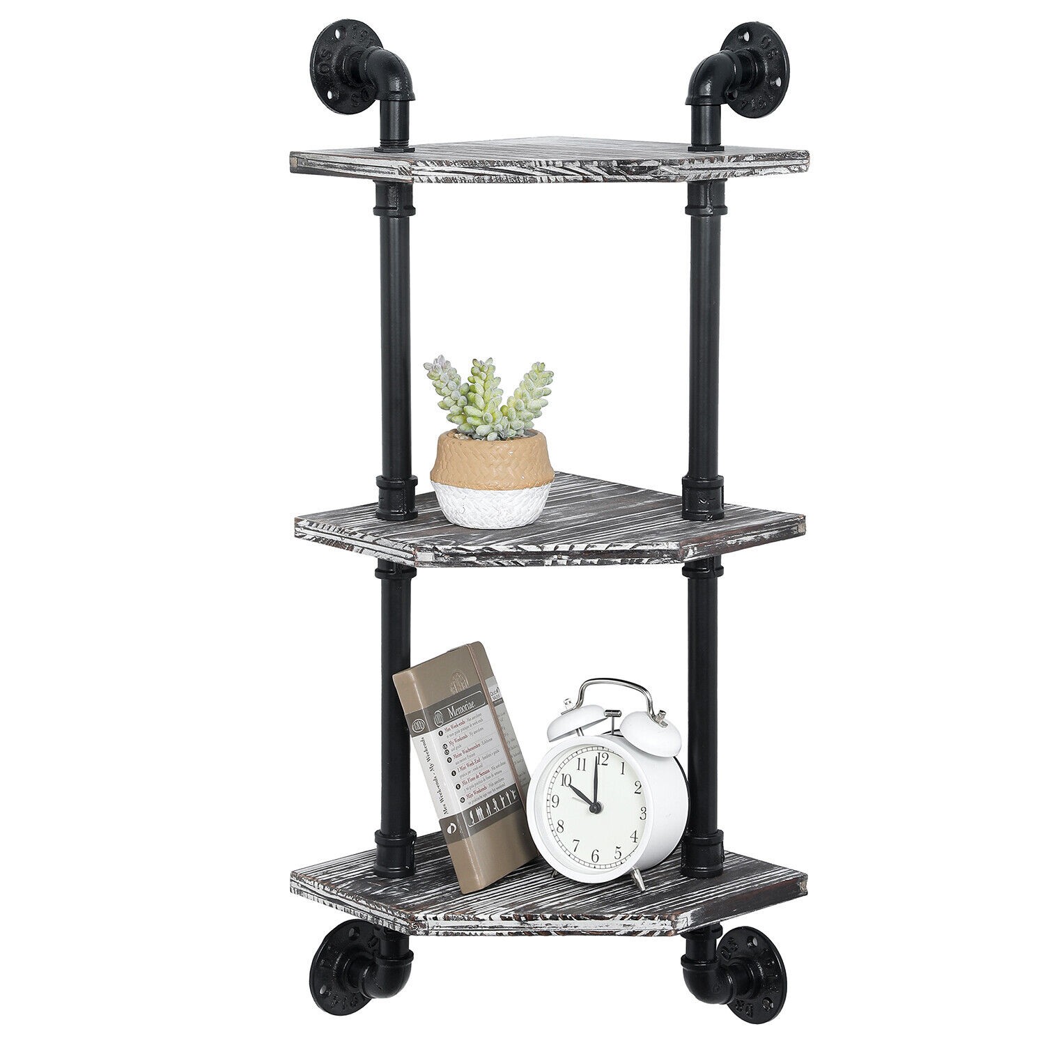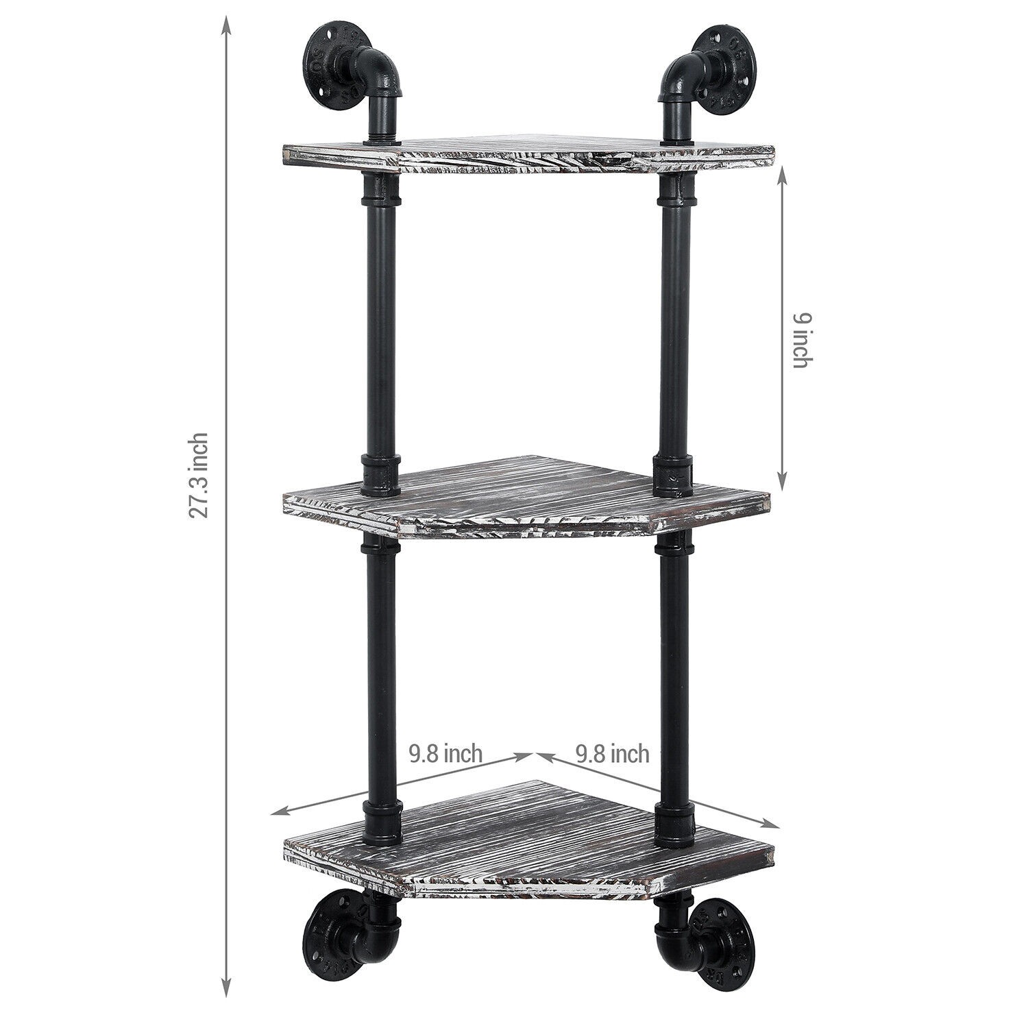 3 Tier Rustic Torched Wood Corner Display Shelves w/ Industrial Metal Pipe Frame