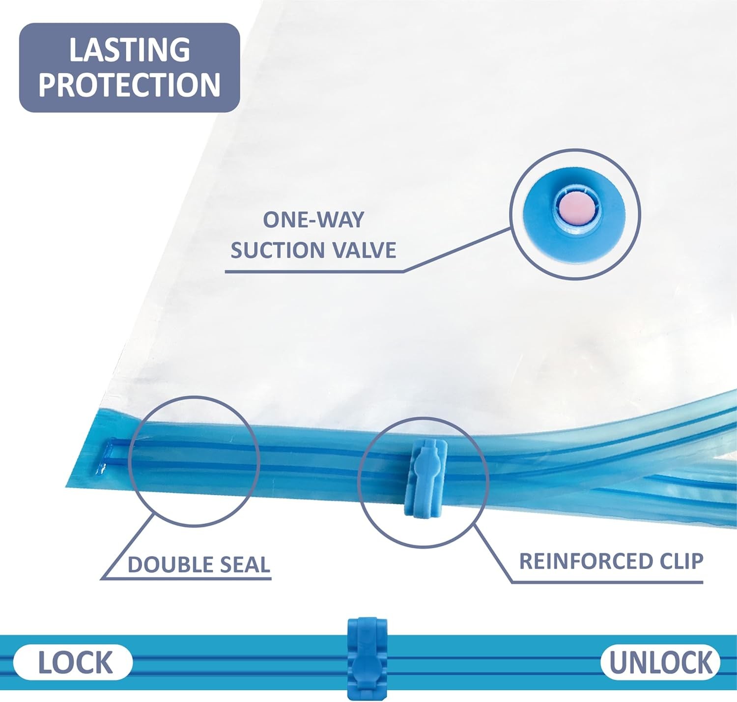Our vacuum bags are made of durable and premium quality PA+PE and double zipper seal. The vacuum bags can be reused multiple times.