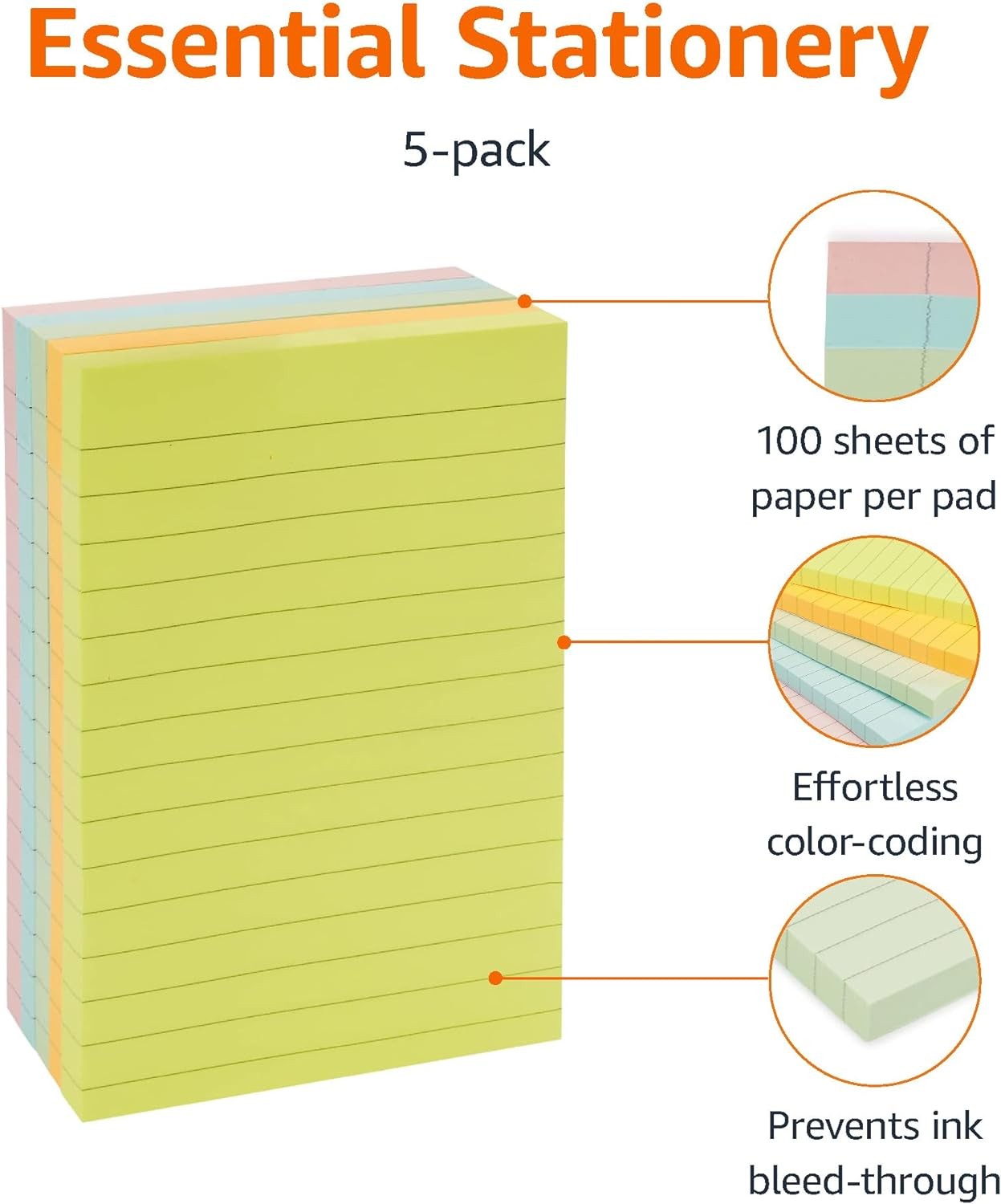 • Includes 5 notepads with 100 sheets of lined paper per pad (500 sheets total) in an assortment of colors