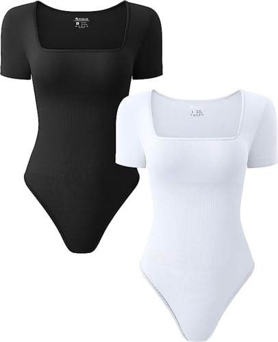 OQQ Women's 2 Piece Bodysuits Sexy Ribbed One Piece Square Neck Short Sleeve Bod
