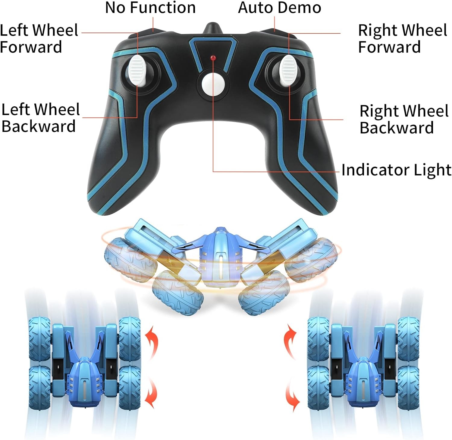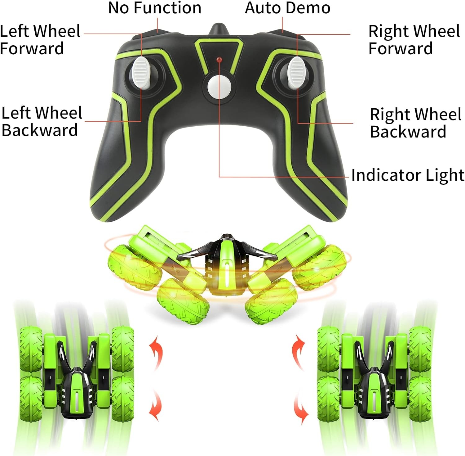 Our Remote Control car can do awesome 360° Rotation, Somersault, and Double-sided running, it can also stand up when it's spinning fast enough. Hold the joystick in the opposite direction to rotate/steer the vehicle. Which will bring you and your lovely kid tons of fun! : ) Regardless of road conditions, it will overcome all obstacles. Let us enjoy the beautiful dance.
