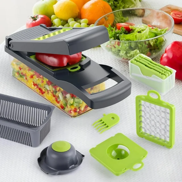 ⭐【Professional 12 in 1 Vegetable Chopper】Multi-Functional & Easy to use vegetable chopper with 7 interchangeable blades through which you can get big or small, thick or thin slices, shreds or Julienne. Press the food chopper lid to cut food directly into onion chopper with container.